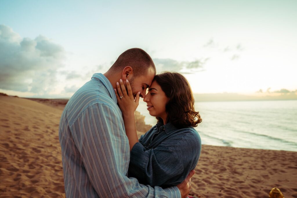 Séance photo engagement entre dunes et océan